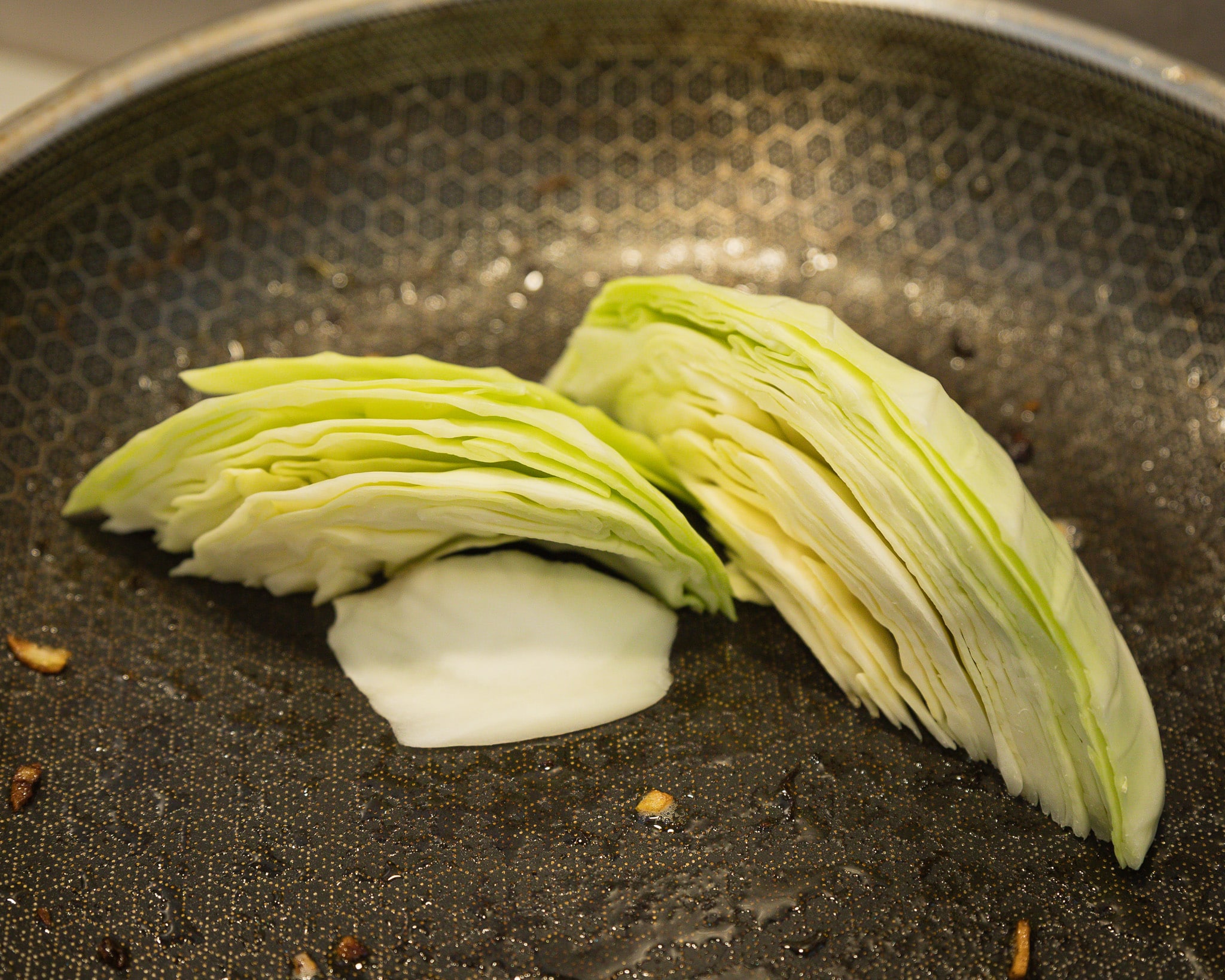 - Kupus narežite na kriške, posolite i kratko pecite s obje strane dok ne dobije zlatnu boju. Koristite drugu tavu ili tanjur za pritiskanje kriški za najbolje rezultate.