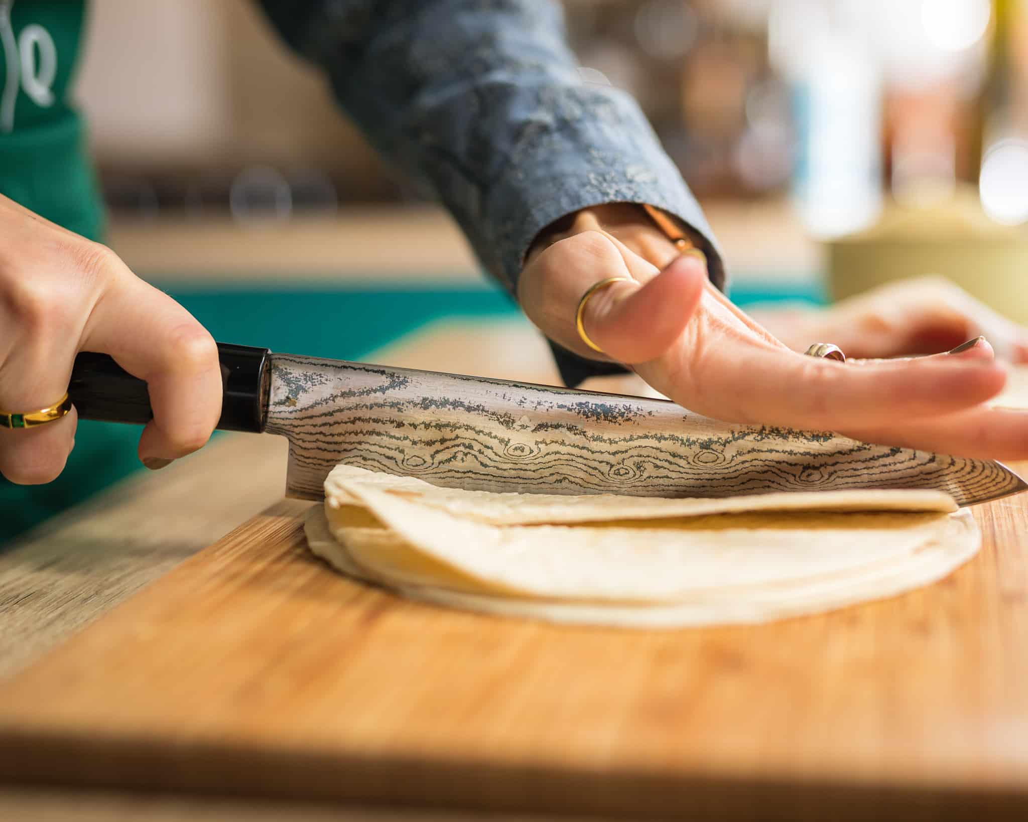 - Svaku tortilju izrežite na 4 jednake trakice po dužini, što će vam dati ukupno 16 trakica.