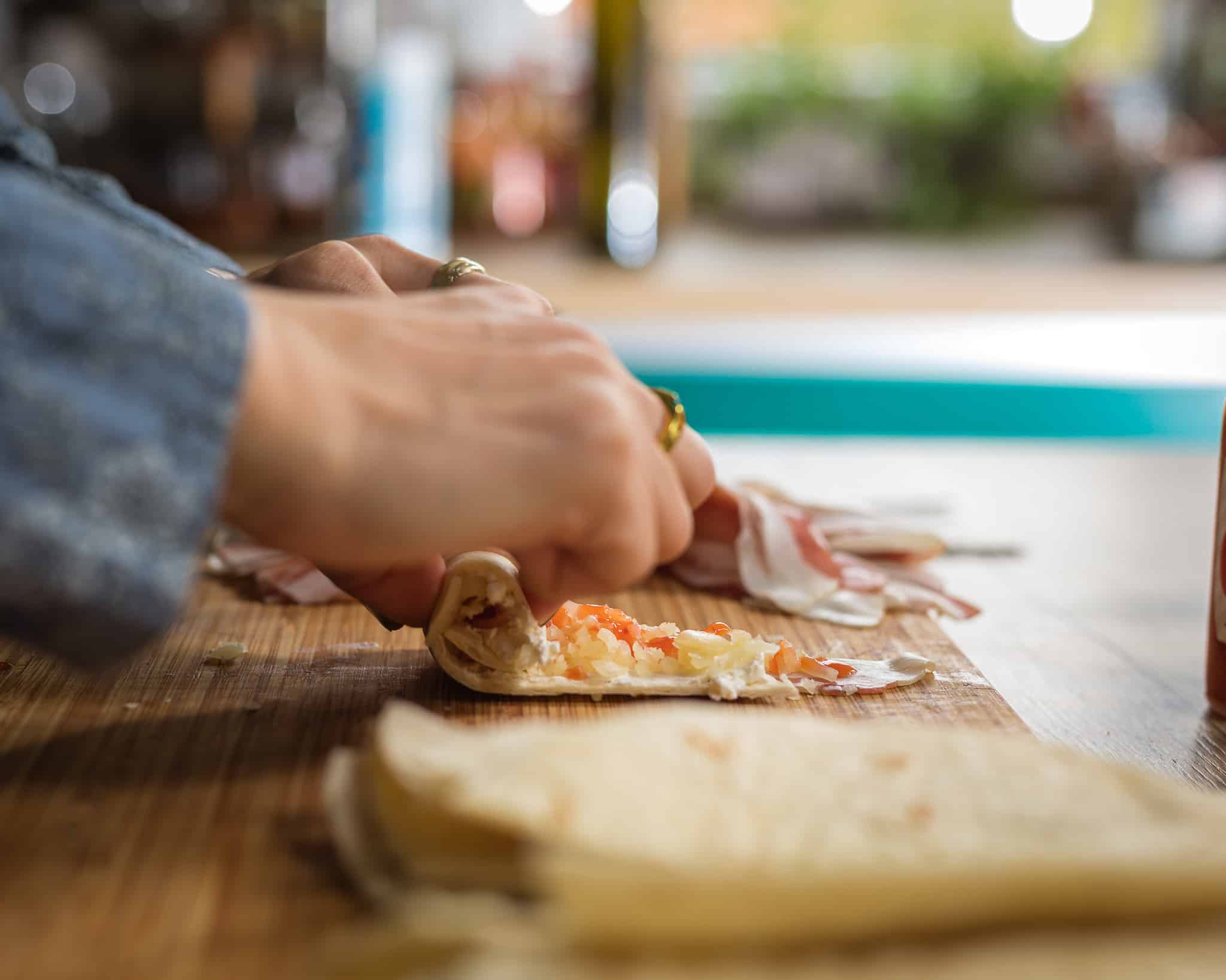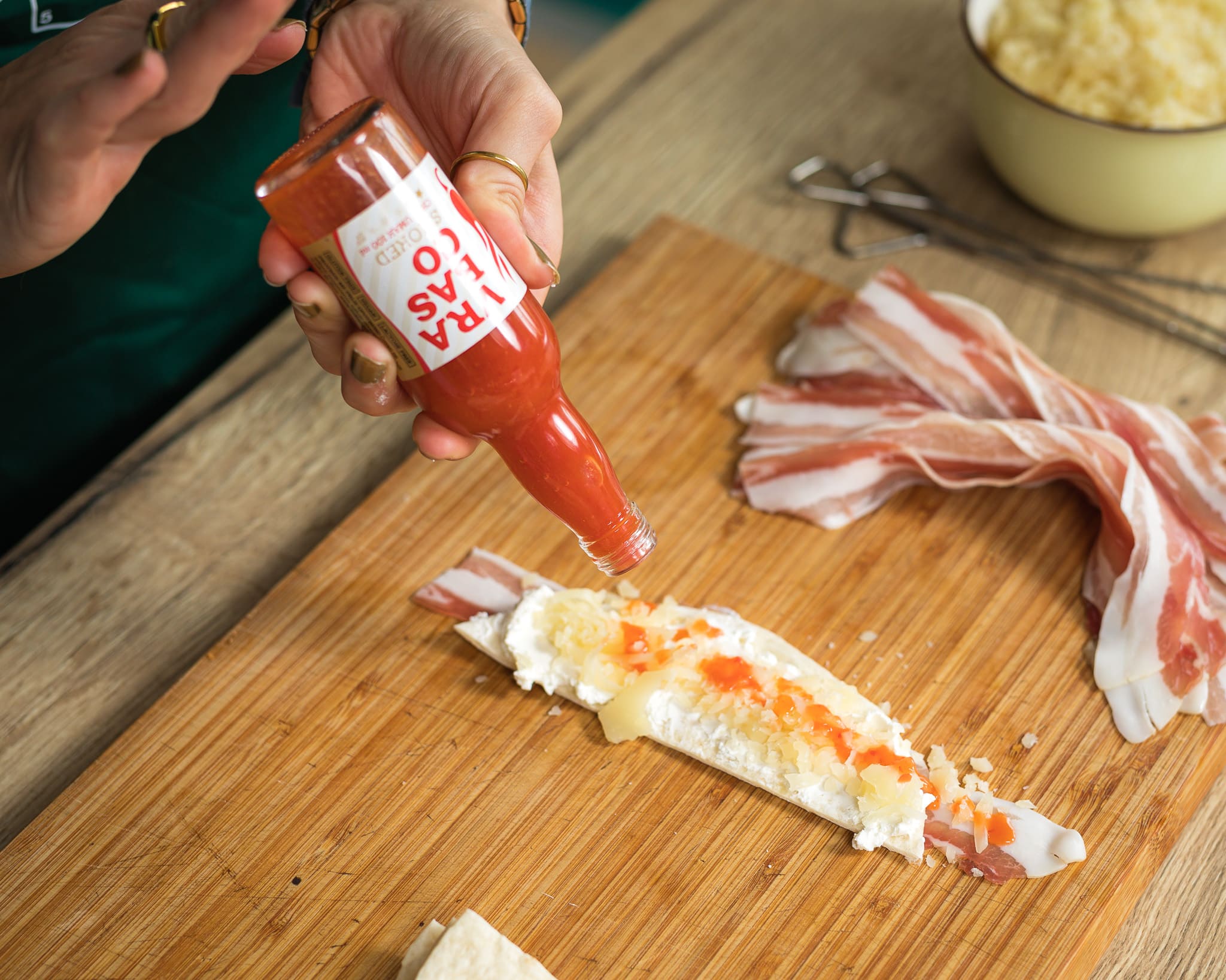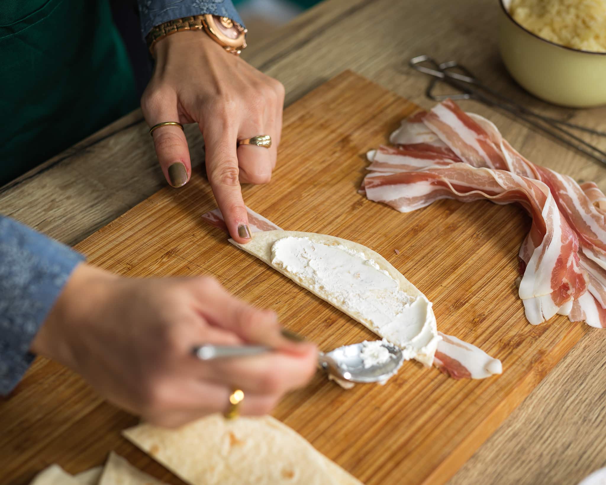 - Na slaninu postavite trakicu tortille, namažite krem sirom za dodatnu kremoznost, pa rasporedite polovice Goude ili naribanog sira tako da prekriva cijelu tortilju.