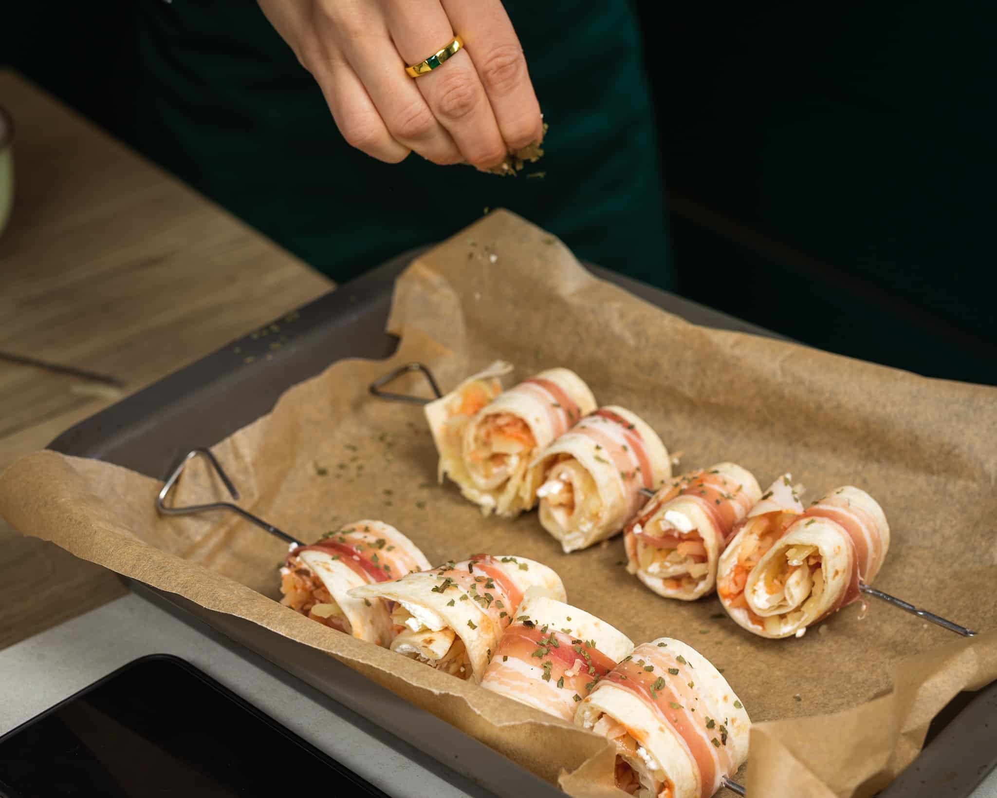 - Složite ražnjiće s rolicama na pleh obložen papirom za pečenje.