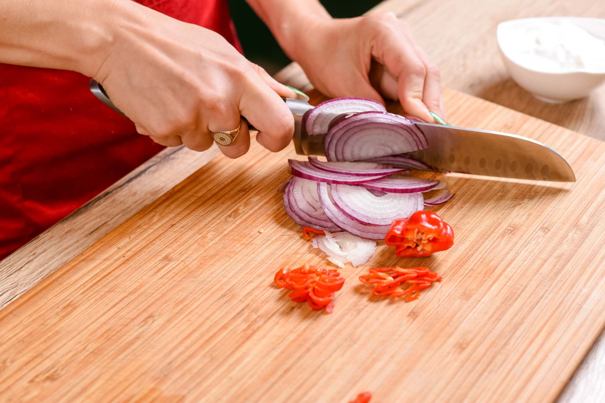 - Crvenu papriku narežite na tanke trakice, a luk na tanke kolutove.