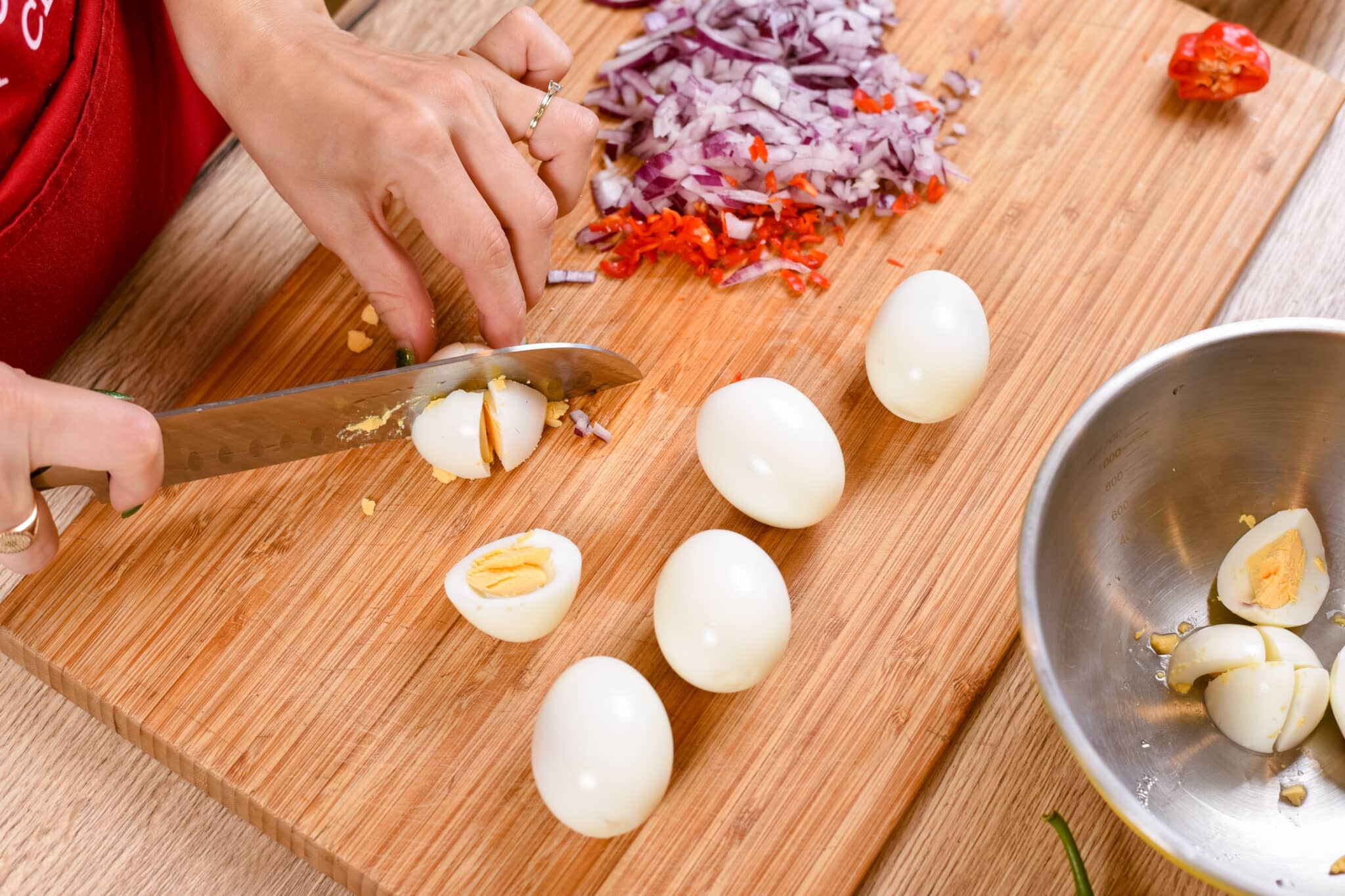- Skuhajte jaja dok ne budu tvrdo kuhana (oko 10 minuta). Ohladite ih, ogulite i narežite na četvrtine.