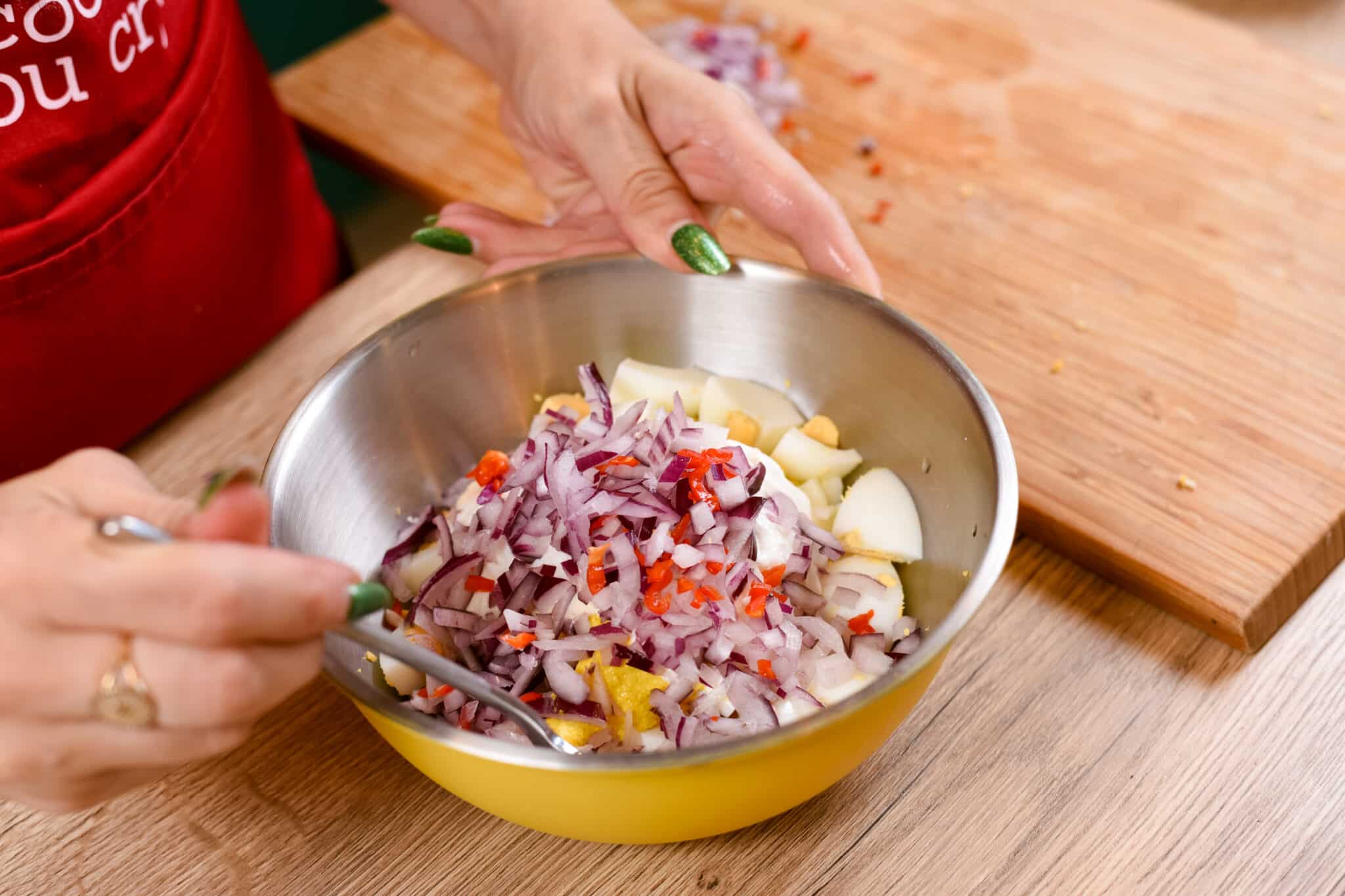 - Lagano umiješajte narezana jaja kako se ne bi raspala.