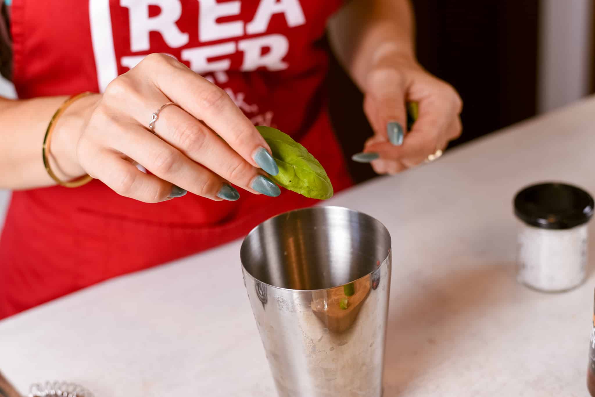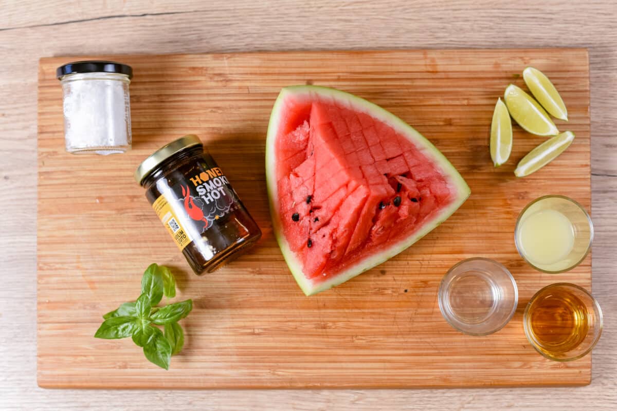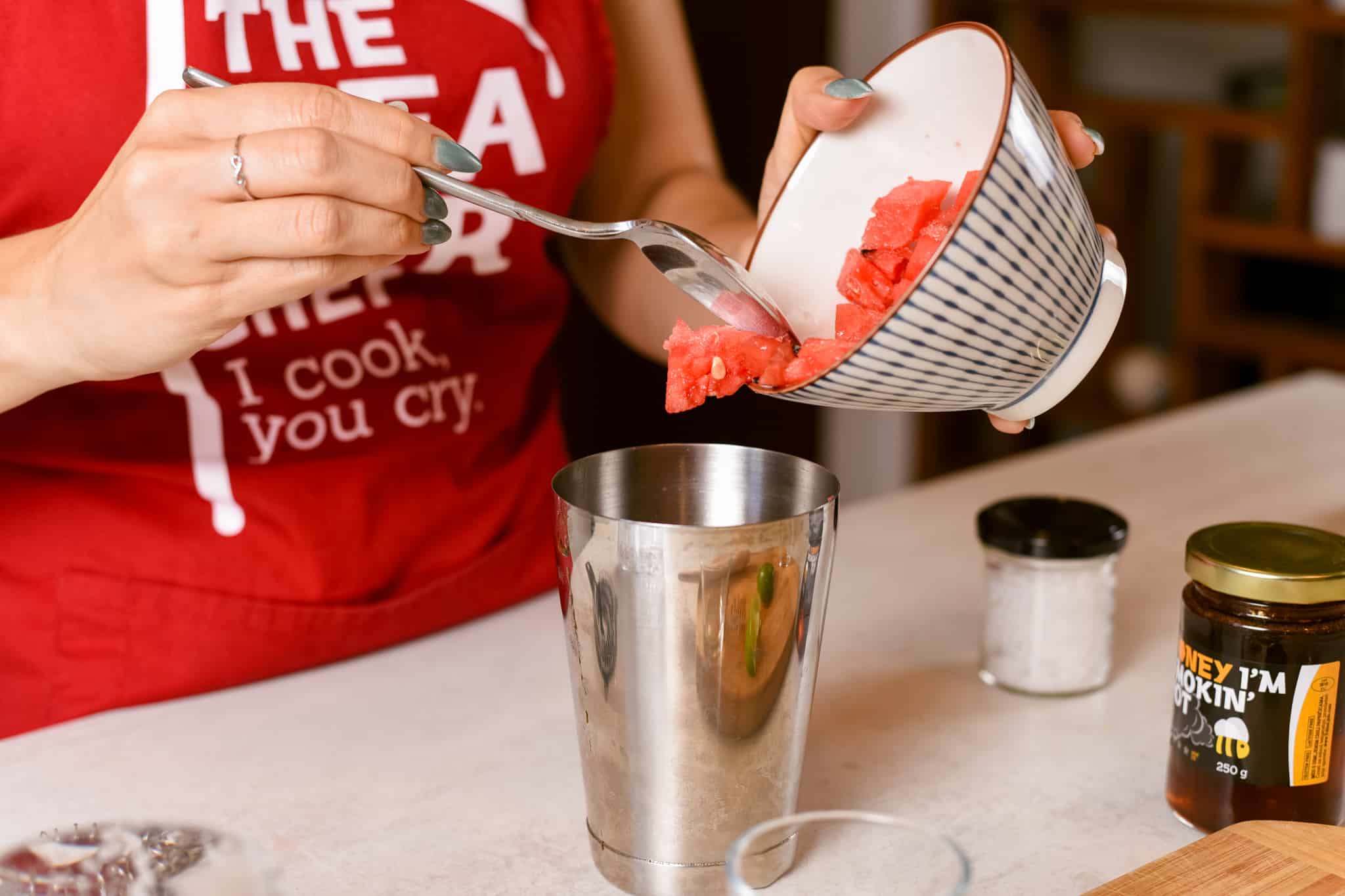 U shaker dodajte par listića bosiljka, šaku lubenice, 22,5 ml triple sec-a, 30 ml soka od limete, 60 ml tequile i 15 ml sirupa od Honey I`m Smokin` Hot ljutog meda.