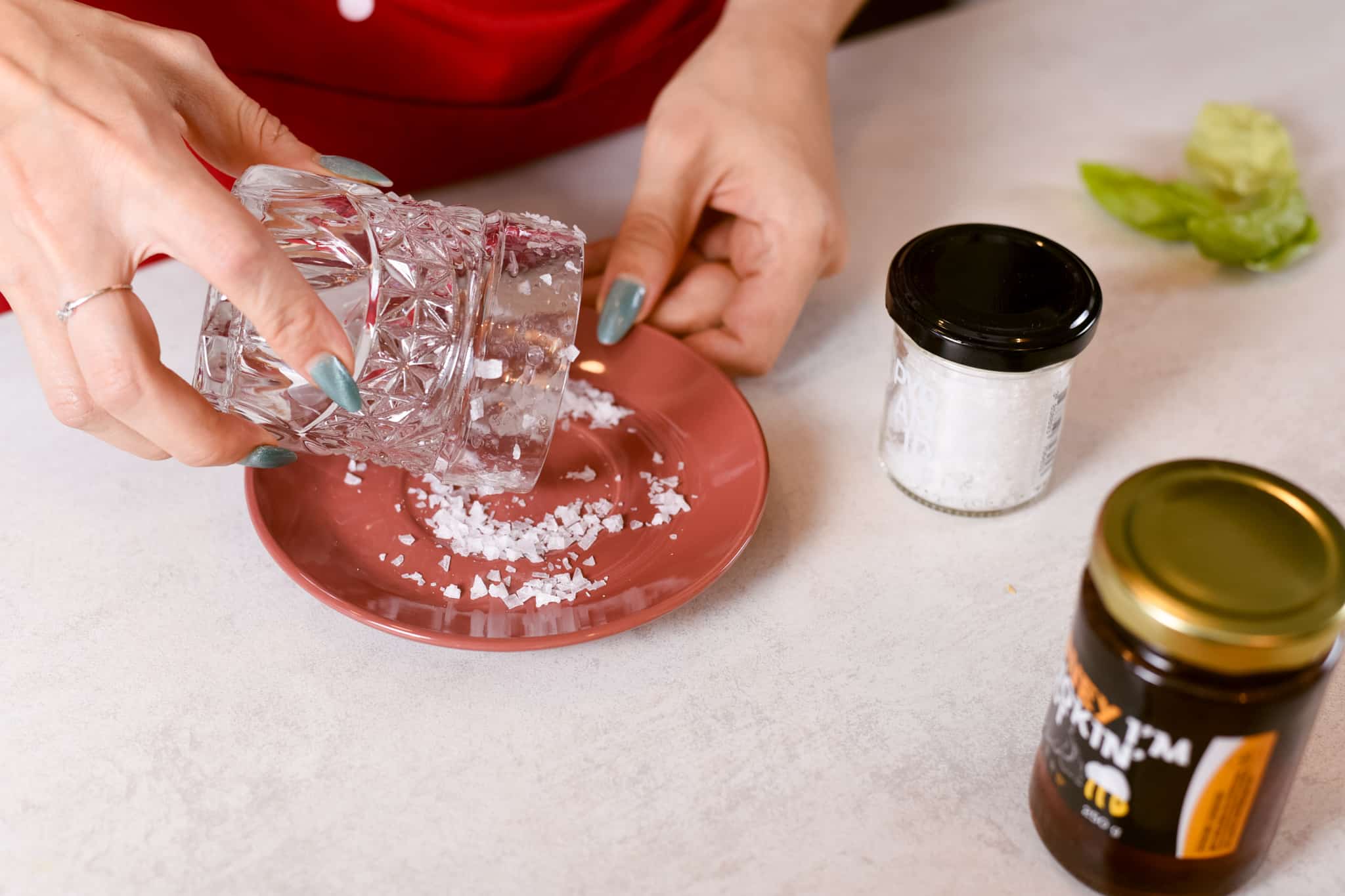 Nisku čašu obrubite sokom limete i Pyramid cvijetom soli i odložite sa strane.