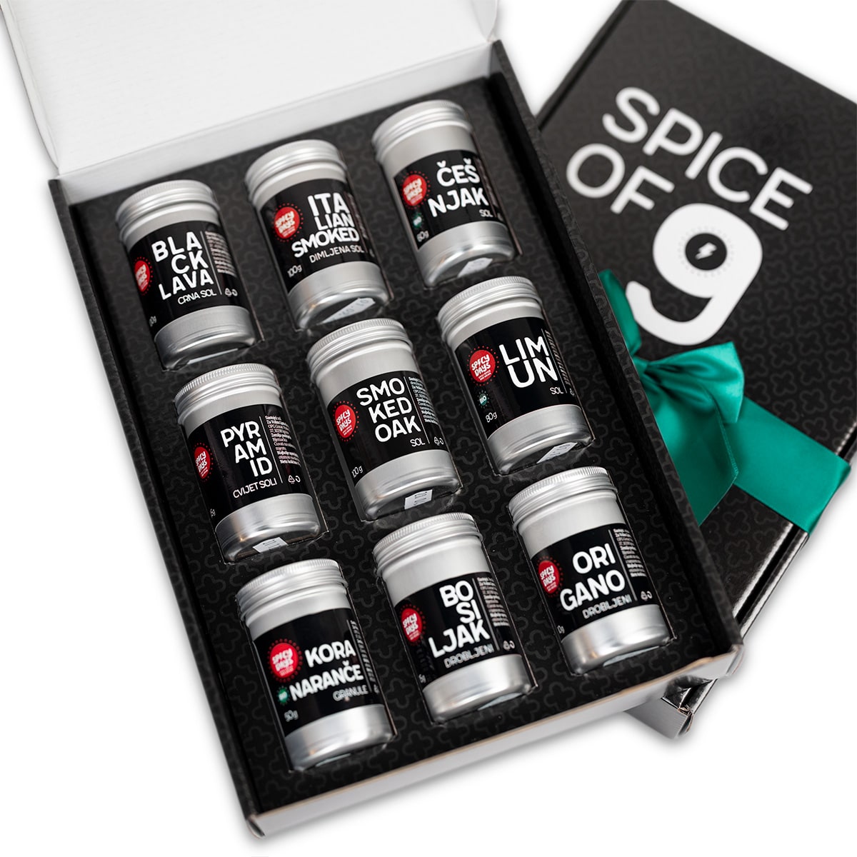 black lava sol, italian smoked sol, češnjak sol, pyramid cvijet soli, smoked oak salt, limun sol, kora naranče, bosiljak, origano