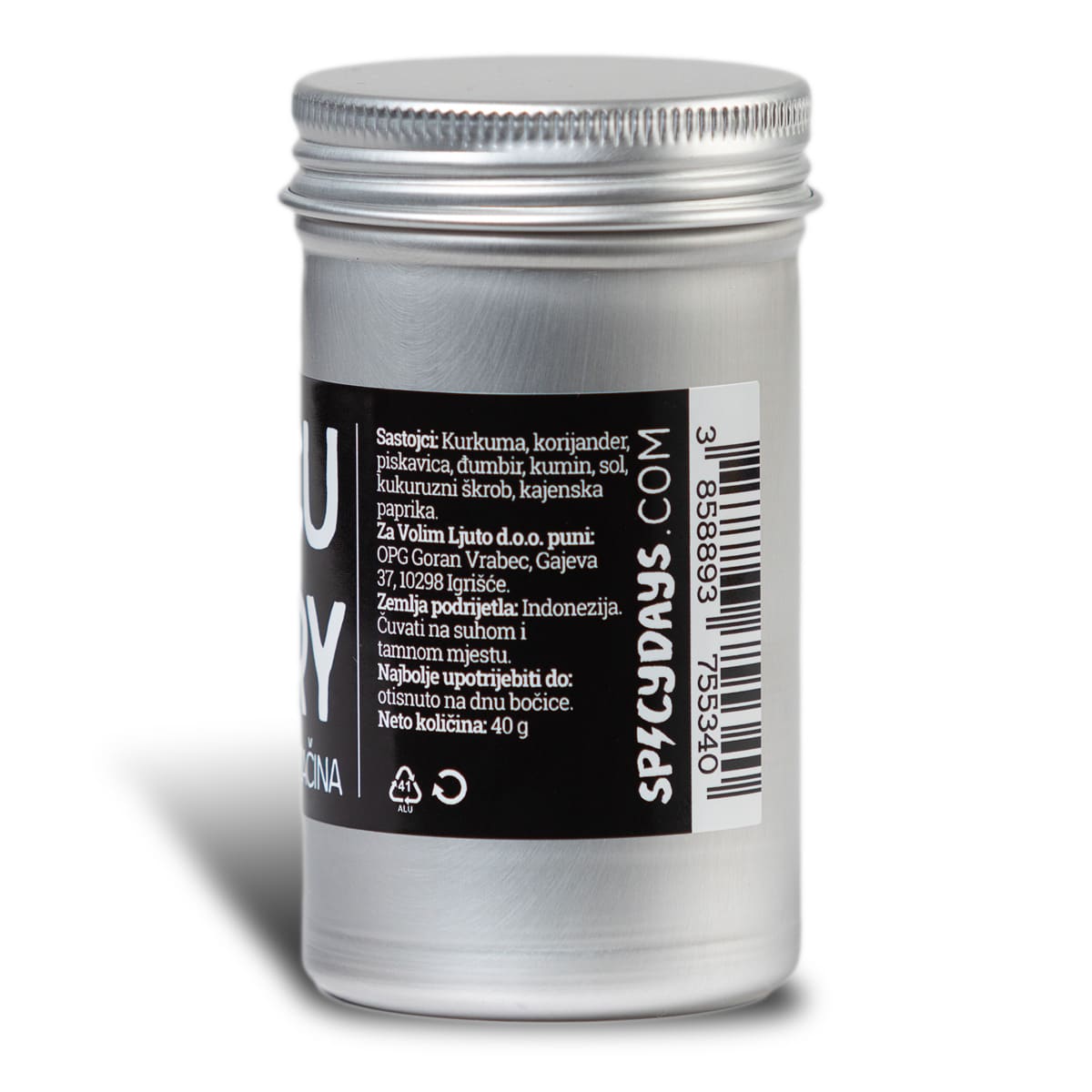 PORIJEKLO: Curry mješavina začina mješavina je raznih začina koja potječe iz južnoazijske kuhinje. Suprotno uvriježenom mišljenju, ne koristi se u autentičnoj indijskoj kuhinji. Zabuna vjerojatno dolazi od popularnog indijskog jela poznatog kao “curry”, ali taj izraz se ne odnosi na mješavinu začina, već na samo jelo. Točan sastav mješavine začina za curry može varirati ovisno o regionalnim preferencijama i individualnim receptima, ali obično uključuje kombinaciju začina kao što su kurkuma, korijander, kumin, piskavica, đumbir, kardamom, cimet, klinčići i crni papar. Mješavina je poznata po svojoj živopisnoj žutoj boji koja dolazi od prisutnosti kurkume, ključnog sastojka u većini mješavina curryja.