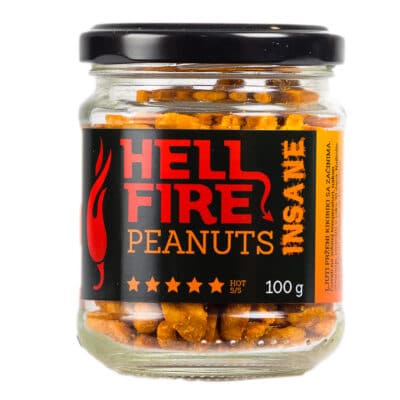 Hellfire Insane Peanuts jedna je od tri varijante ljutih kikirikija koje ćemo ponuditi. Ovaj je najljući, ljutine 5 od 5 koja stvarno predstavlja patnju u obliku Caroline Reaper. Pri konzumaciji se osjeća bol nakon koje slijedi samo patnja i žaljenje zbog konzumacije, nakon čega slijedi želja za još malo. I tako ukrug!Ne sadrži umjetne dodatke i konzervanse!