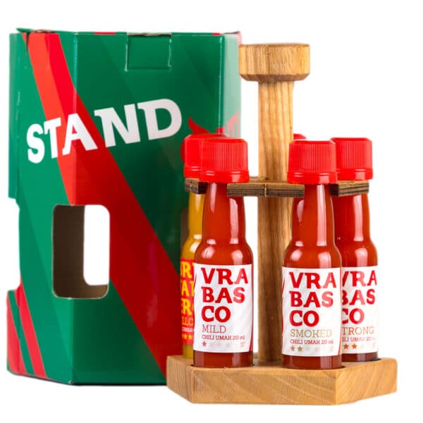 Na stalku dolazi fiksno 5 naših umaka: Vrabasco Mild, Vrabasco Smoked, Vrabasco Strong, Vrabanero Smoked i Brutalero Yellow!