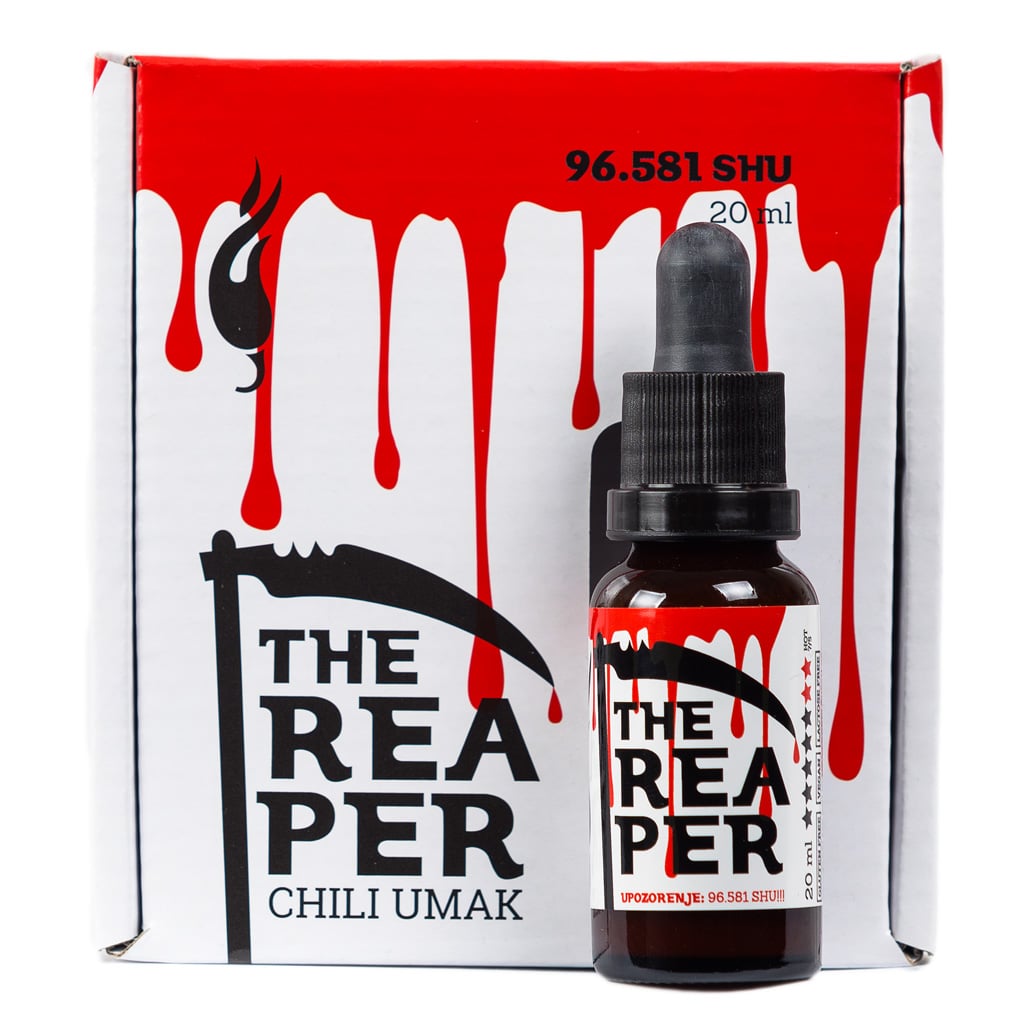 The Reaper je ljuti umak napravljen od 85% ferementiranih Carolina Reaper papričica uz dodatak vinskog octa i začina. Umak je pakiran u bočice od 20ml i ima posebnu kapaljku uz doziranje, a Carolina Reaper je do 2023. bila najljuća u Guinnessovoj knjizi rekorda. Ovo je najljući umak dobiven fermentacijom koji trenutno imamo u prodaji, stoga ga konzumirajte pažljivo! Ako želite još ljuće umake koji imaju dodatak ekstrakta čistog kapsaicina, provjerite The Resurrection (433.534 SHU) i The Last Supper (850.000 SHU) koji nisu baš za one slabog srca, no jesu za one koji vole nenormalno i neizdrživo ljuto.